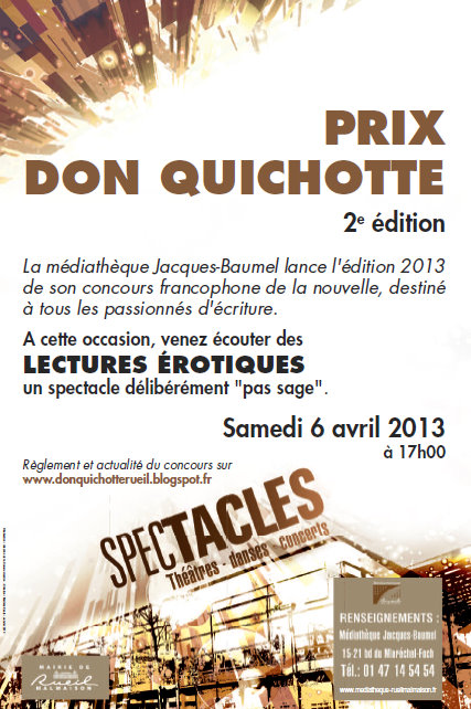La ville de Rueil-Malmaison organise chaque année un concours de nouvelles dont le premier prix est un voyage au Festival du Livre de Montréal. Je vous invite à lire ici le joussif journal de voyage de Fabien Pesty, lauréat du prix en 2012. Fabien Pesty m'avait fait envie. Enfin, son récit, pas lui, je ne suis pas celle que vous croyez, même si j'ai des dents. Non mais, n'importe quoi. Bref, en ce début 2013, je guettais l'ouverture des hostilités, et voici ce qui me tomba sous les yeux. Nous étions, sur Oniris, en plein débat sur le forum "érotisme en littérature". Vous pouvez imaginer à quel point je frétillai à la lecture de l'intitulé de la soirée inaugurale du concours. Je me mis aussitôt à me documenter sur les geishas, parce qu'à part quelques lectures nippones un peu olé olé et une grande partie de la filmographie de Kurosawa, largement motivée par Quelques jours plus tard, paf, le sujet du concours tomba : "Passages". La douche froide (à propos, je charge amicalement les Rueillois du site - qui se reconnaîtront - de faire cuire à petit feu le responsable de ce stupide jeu de mots, on n'a pas idée de faire des choses pareilles). Et c'est ainsi que l'idée de la narratrice évoluant dans un musée m'est venue, puisqu'après tout, je n'avais fait autre chose qu'imaginer la vie d'une jeune fille à partir d'estampes, et que les passages de son existence se sont doublés de celui de cette narratice d'une salle à une autre (ce que décrit fort bien toc-art). La froideur du récit notée par la majorité des commentateurs est bien entendue voulue, elle fait pendant au style des estampes, qui paraît si impersonnel - peut-être les Asiatiques ont-ils un autre avis. J'ai voulu la contrebalancer par un humour distant : merci, alvinabec, d'avoir ri ! En ce qui concerne le style, et les longues phrases chargées, je reconnais m'en être donné à coeur joie : j'ai une tendance fâcheuse à l'emberlificotage dans les adverbes et les adjectifs, et là, j'ai lâché la bride, également pour coller à la multitude et la minutie des détails des estampes. Je n'ai pas trop saisi si c'était le sens, ou le style, (ou les deux) de la première phrase qui avait gêné toc-art et Acratopège. Pour le style, mea culpa. Pour le sens, les potions dont il est question sont abortives, si c'est cela que vous n'aviez pas saisi (et sinon, discutons-en ici). placebo : tu peux tout imaginer sur la mort de Masami. Même une fausse route. Remerciements très chaleureux à Salamandre (votre commentaire me touche, après nos échanges sur le forum "érotisme en littérature") et HELLIAN, ainsi qu'au responsable d'un exceptionnel "exceptionnel +", même s'il s'agit de brabant dont je connais la tendance à un enthousiasme effréné, hautement sympathique. Prix spécial du jury à Widjet pour son "très bien" que j'ai relu dix fois en me frottant les yeux, après avoir redémarré mon ordi et réalisé les mises à jour. Sur PC, j'aurais lancé un scan avec l'anti-virus. Pour la petite histoire, ce texte n'a même pas passé les premières sélections à Rueil